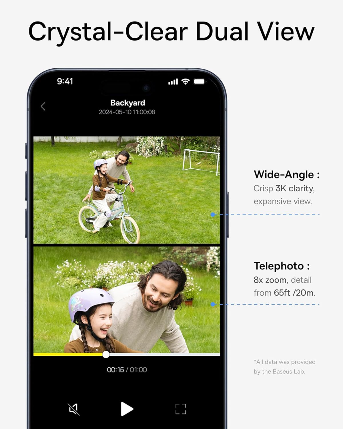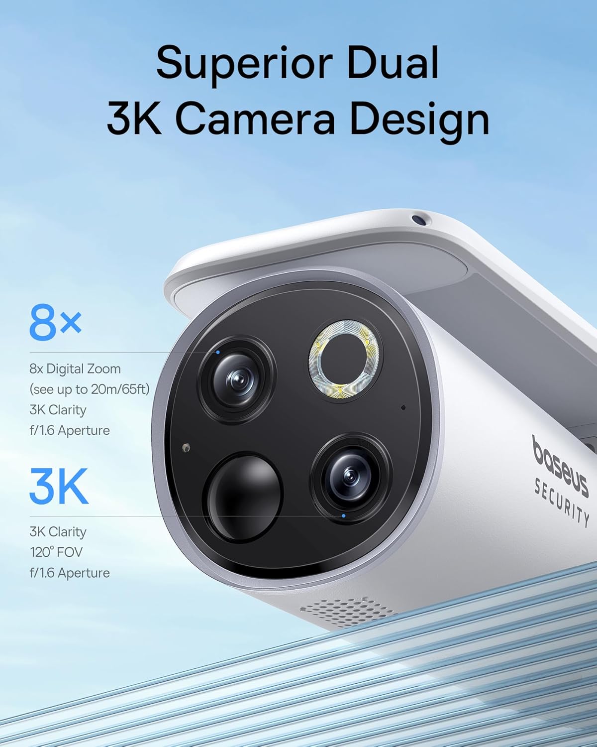- Dual Cameras with 3K Clarity: Equipped with dual cameras for comprehensive coverage, S1 Pro wireless solar security camera delivering sharp 3K HD video. The wide-angle and telephoto lenses allow you to monitor your surroundings in detail, even at night with Color Night Vision.You can check both cameras simultaneously in the APP.