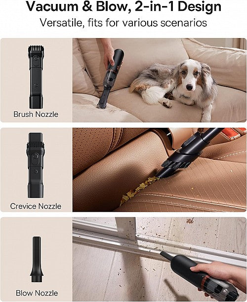 - CAR VACUUM CLEANER HIGH POWER CORDLESS: Scrape off persistent dirt to vacuum every corner in one shot with versatile suction nozzle built with soft bristles brush 2-in-1
