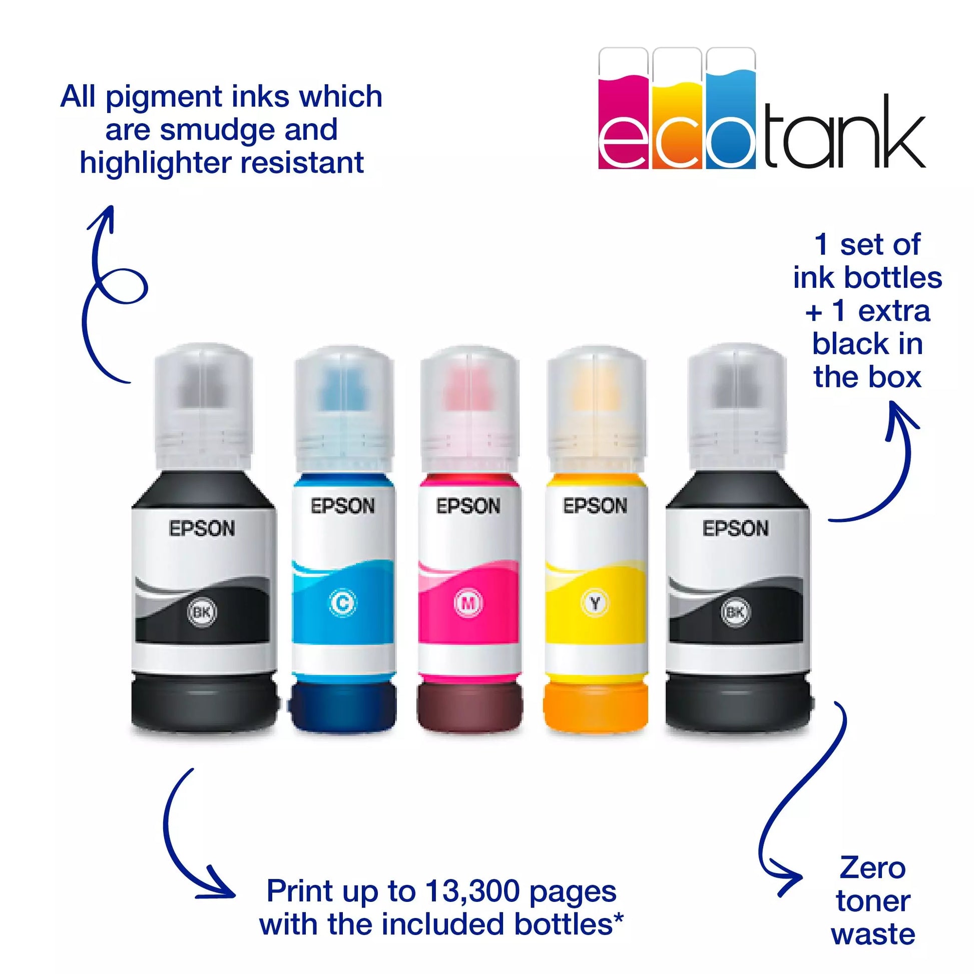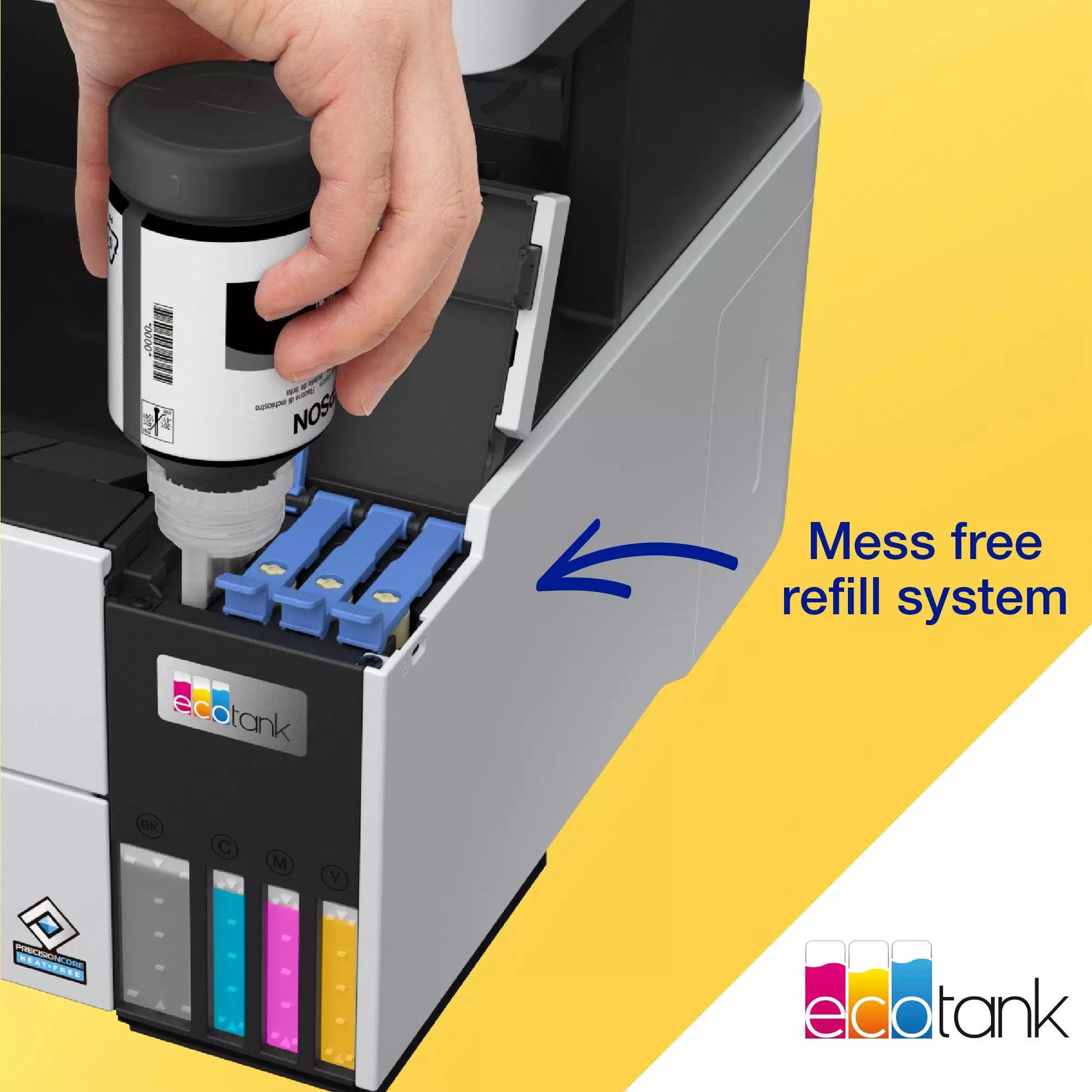 - Simple hassle-free ink tank system lets you refill from bottles Plus the EcoTank key-lock bottle system ensures it's mess-free too