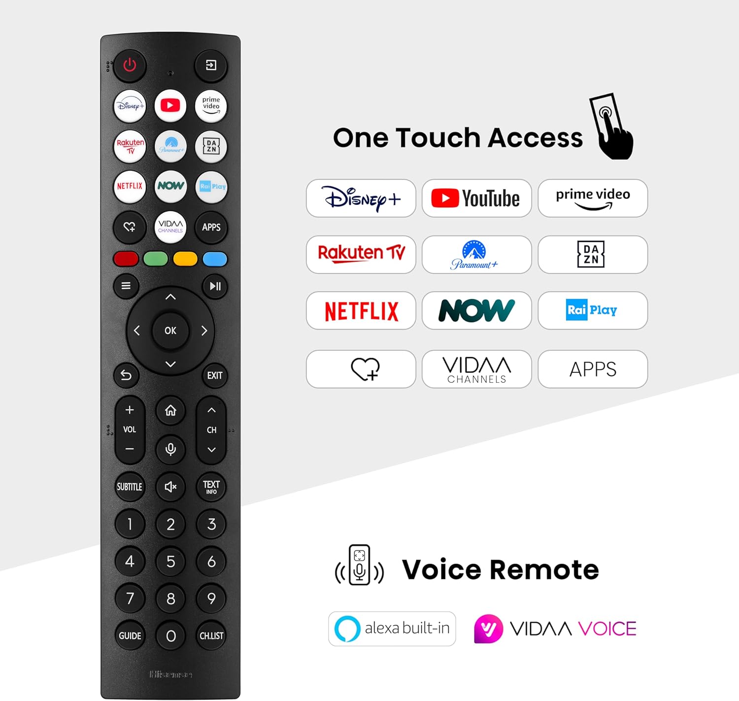 - Remote Control with Voice Control Control the TV with your voice, just press the microphone button on the remote. You can change the channel, adjust the volume and much more.
