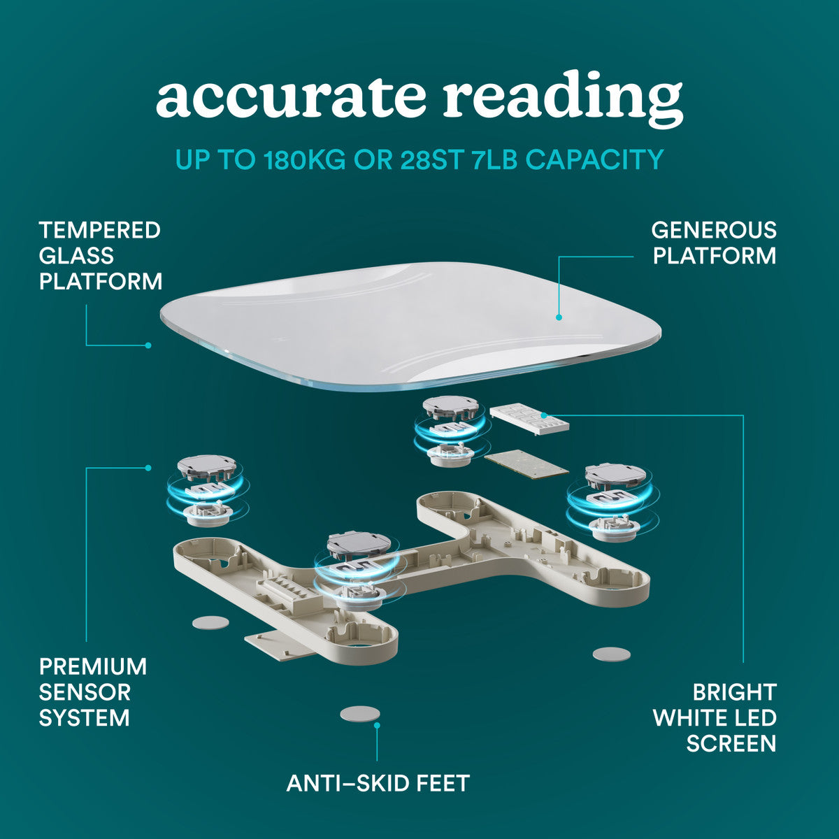 - PRECISE DIGITAL BATHROOM SCALES: Four finely-tuned, pre-calibrated metal load cells identify even the smallest changes in weight in 0.1kg/0.2lb increments up to 180kg, providing precise, reliable bathroom scale readings that you can trust