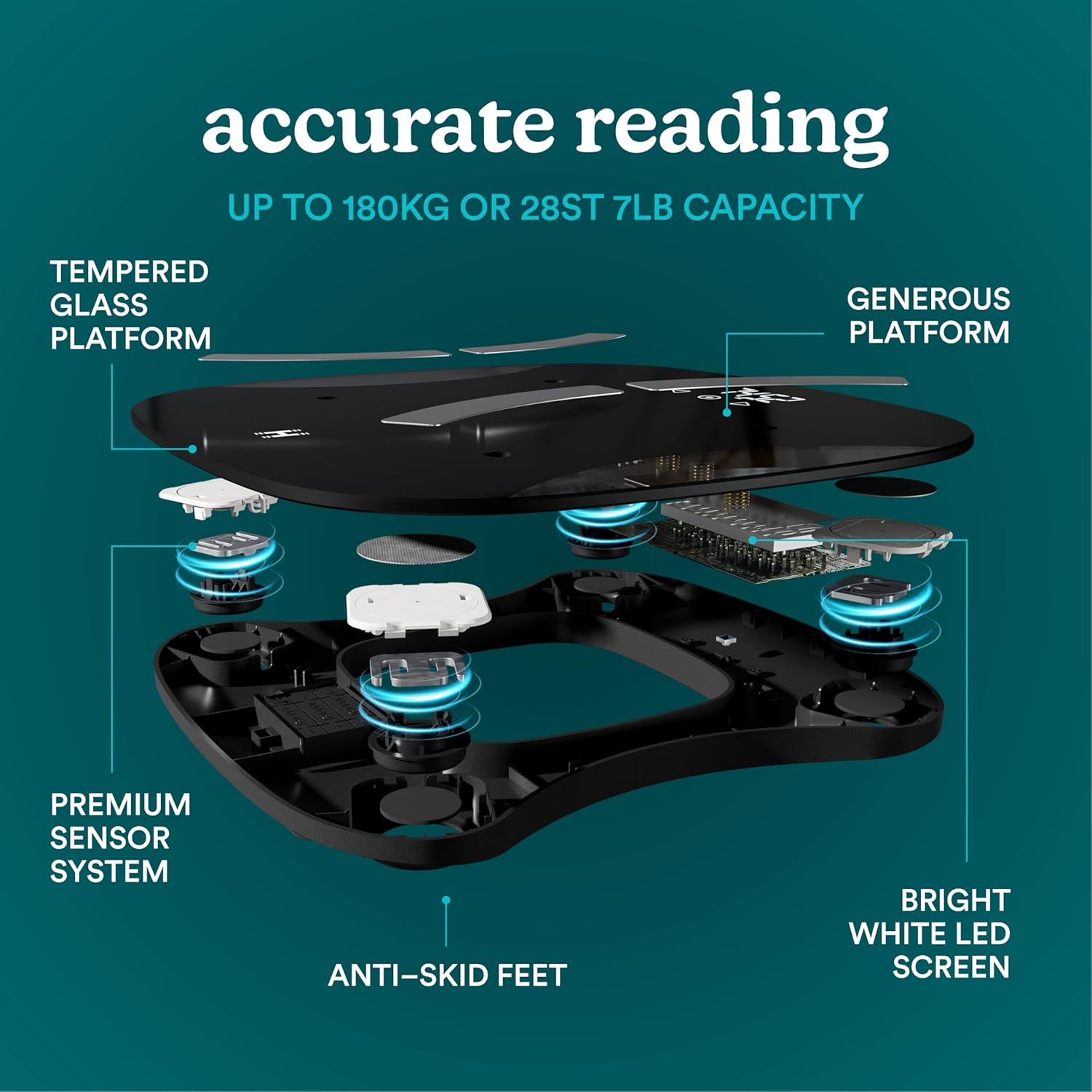 HIGH CAPACITY & VERSATILITY: With a 400lb/180kg capacity, this body weight scale offers precise measurements as body composition scales & body fat monitors, displaying results in your choice of kg, st:lb or lb units. Powered by 3x AAA batteries (included)