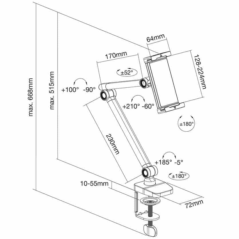 Variable clamps suitable for tablets of different sizes from approx. 4.7” to 12.9”,
