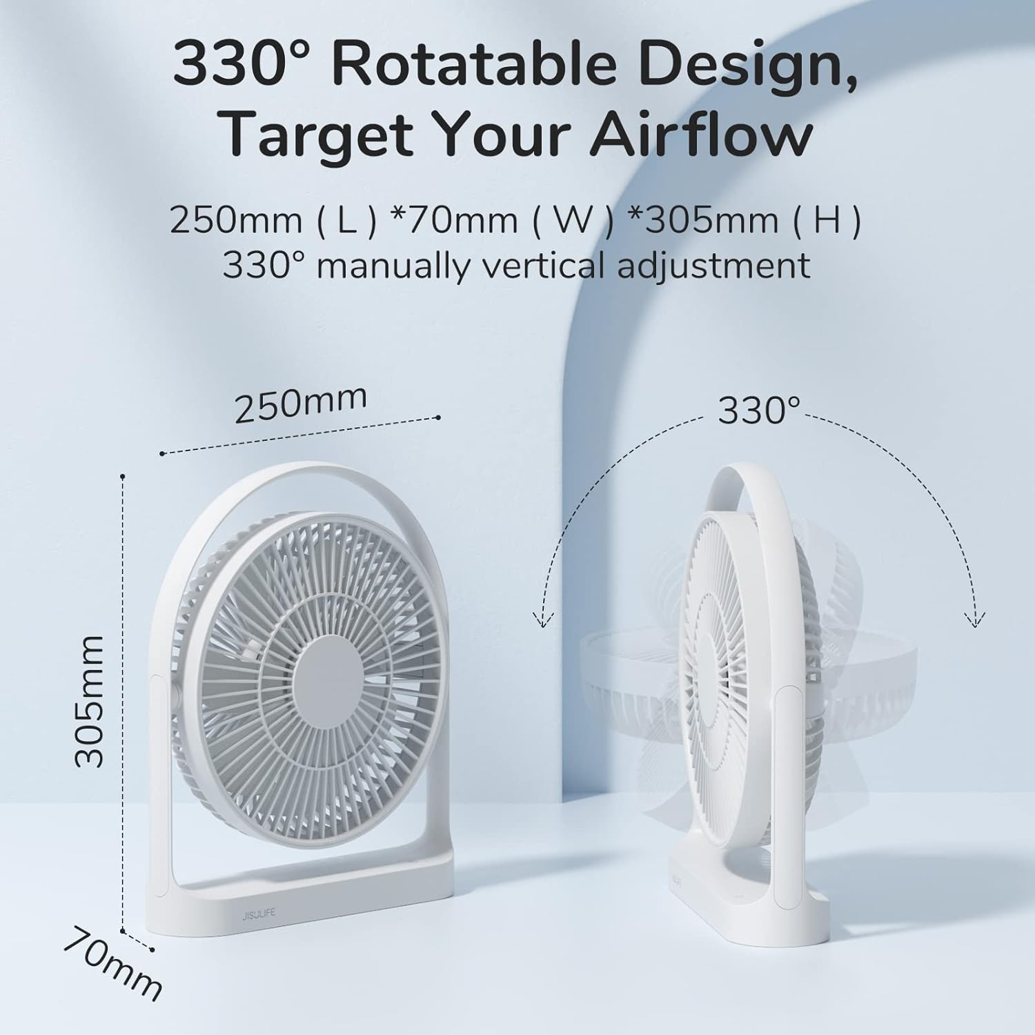 - A Daily Cooling Compaion JISULIFE FA27 multi-functional portable fan would be a daily cooling essential companion for working/studying/sleeping/camping/cooking or outdoor activities. You can customize wind speed and target airflow direction with 4 wind speed options and a 330°manually rotation head featured.