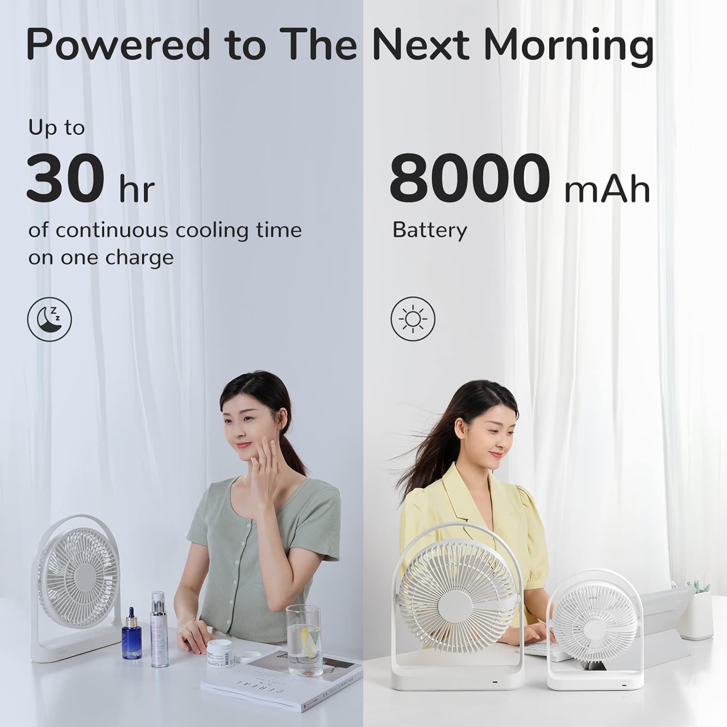 - 30H Max Duration, Cool Off to The Next Morning With a built-in 8000mAh large battery capacity, the FA27 desk fan allows you to enjoy cooling up to 30h max under soft wind speed. No worry about waking up at night. It also would be a nice choice for camping for its super long cooling time and wireless design. Just remember to get it fully charged (5-6 hours) in advance. Easily charge with an included USB-C charging cord through USB adapter.