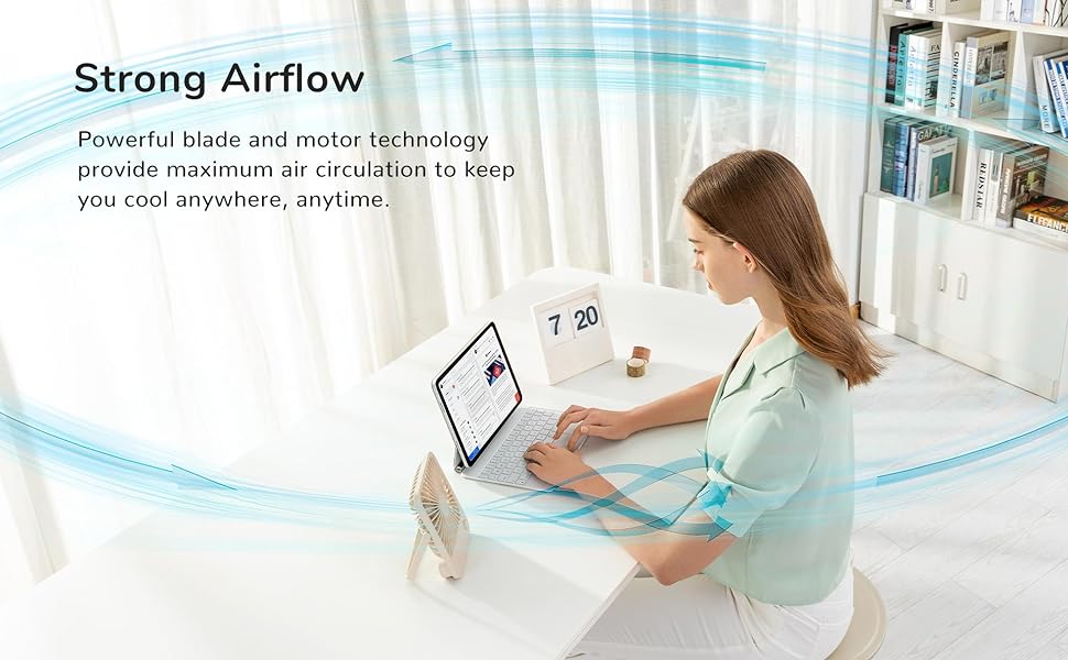 - Portable & Gift Choice FA26 desk fan weighs only 216g with cordless design, lighter, thinner, and more portable. It's tough for use in office, desktop, bedroom,kitchen, camping, travel, etc. Practicality as a gift for women men kids.