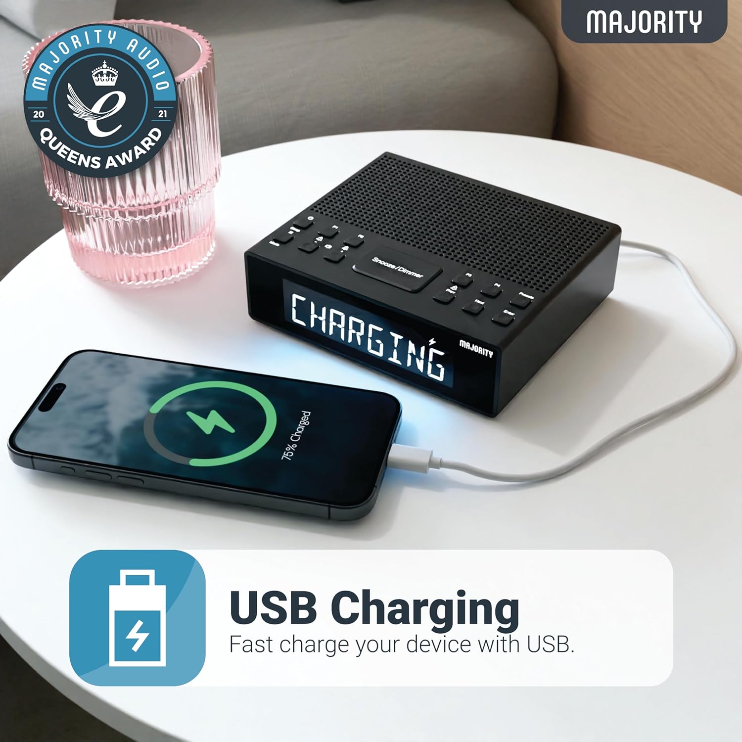 Majority Radio KNAPWELL Bedside Clock Dual Alarm FM,BT,USB Charging