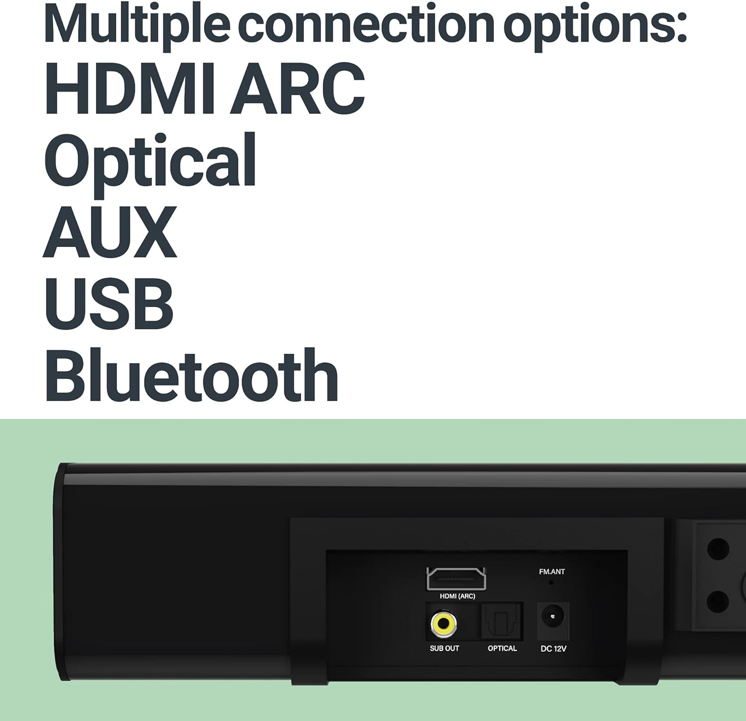 - PACKED FULL OF FEATURES: Our soundbar and subwoofer has been designed with ease of use in mind - simply plug in, and play using the wide range of connections. Connect to your TV in lightning speed by using the HDMI ARC or optical input for high clarity and rich audio. Listen to your playlists straight from your phone through the latest Bluetooth technology, plug in your MP3 player to the AUX or USB input.