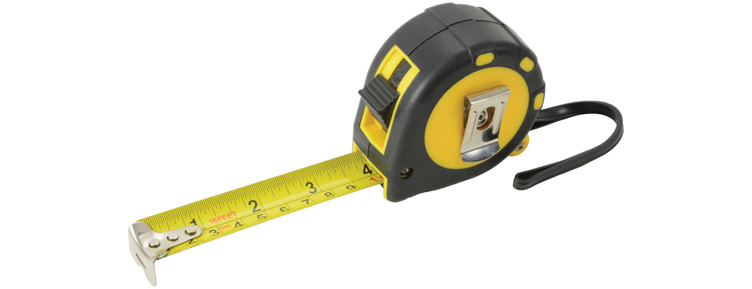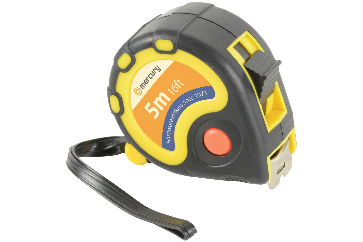 A retractable 5m / 16ft heavy-duty tape measure. Features a thumb locking mechanism, enabling measurements to be retained for reference or comparison, and a pause button on the base, which temporarily holds the blade while finger pressure is applied; ideal for marking out measurements, for example. A belt clip and wrist strap provide hassle-free portability and ease of access in all locations and situations.