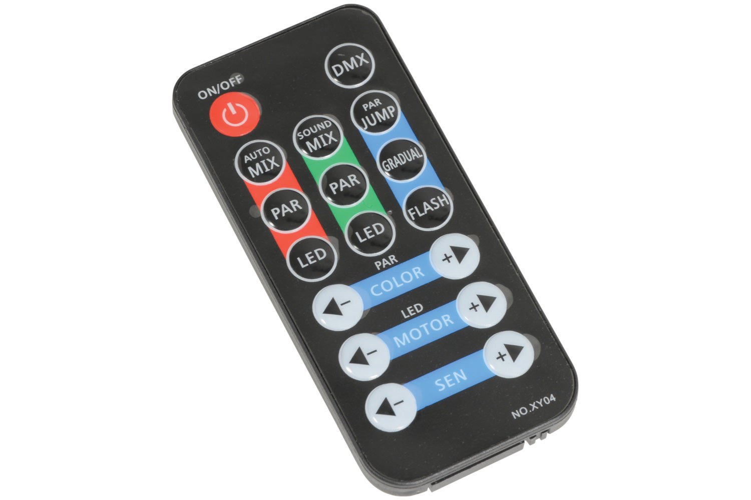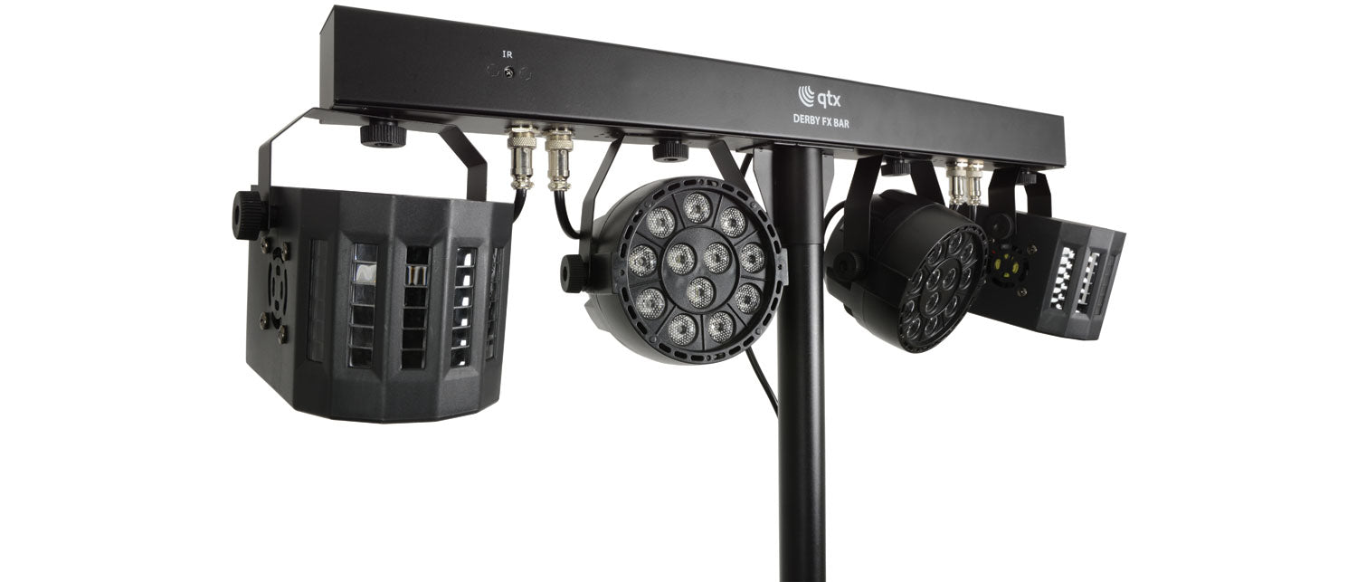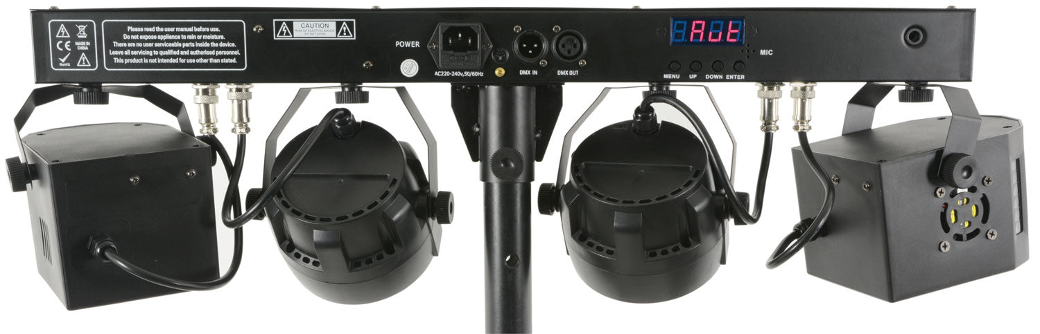 Portable lighting set with 2 PAR cans and 2 LED derby effects powered from a main T-bar. Controlled via DMX, infra red remote control or internal auto and sound-activated programs selectable from a control panel. Each lighting fixture is angle-adjustable to distribute colour washes and effects around the room. Designed as a complete light effects solution for parties, performers and special events.