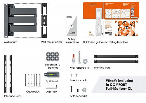 This is the one: the strongest Full-Motion+ TV wall mount in our family-friendly COMFORT series. Stylish and safe. The wall mount is suitable for TVs up to 100 inches in size and weighing up to 55 kg. Depending on your TV size, the wall mount can be rotated up to 180° and tilted up to 10° for optimal viewing comfort. Your TV is guaranteed to be mounted safely and securely. If you would like to enjoy your large TV to the fullest from every angle, this is the TV wall mount you need.