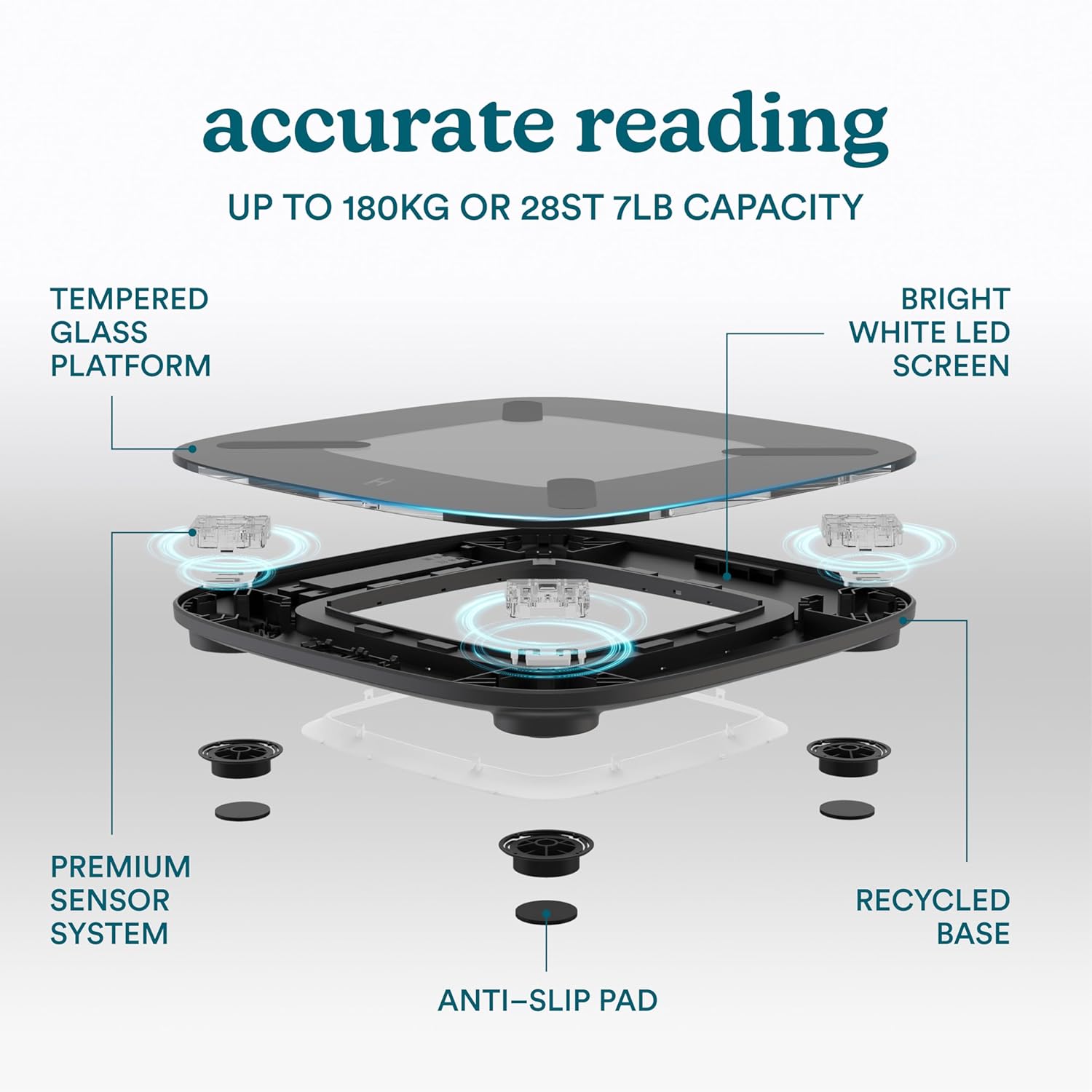 - CONSCIOUSLY CRAFTED: Designed with a 100% recycled plastic base, these body weight scales reflect a commitment to sustainability. Ideal as electronic weighing scales for diagnostics & health monitoring at home