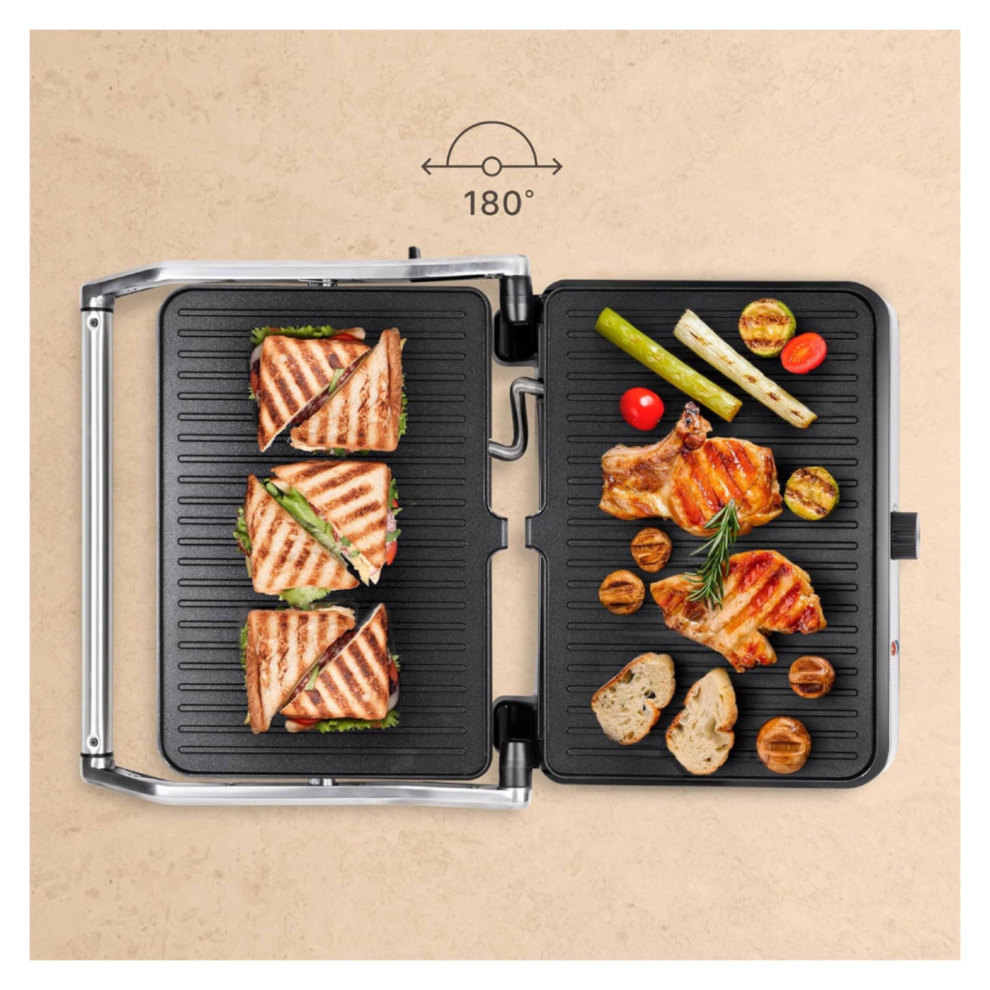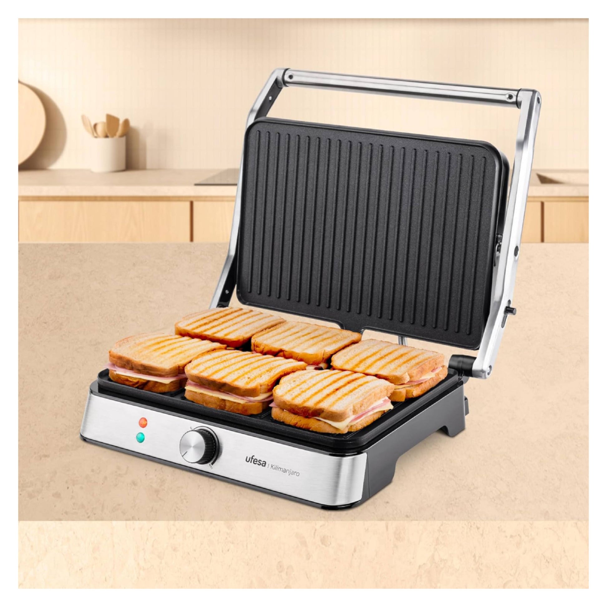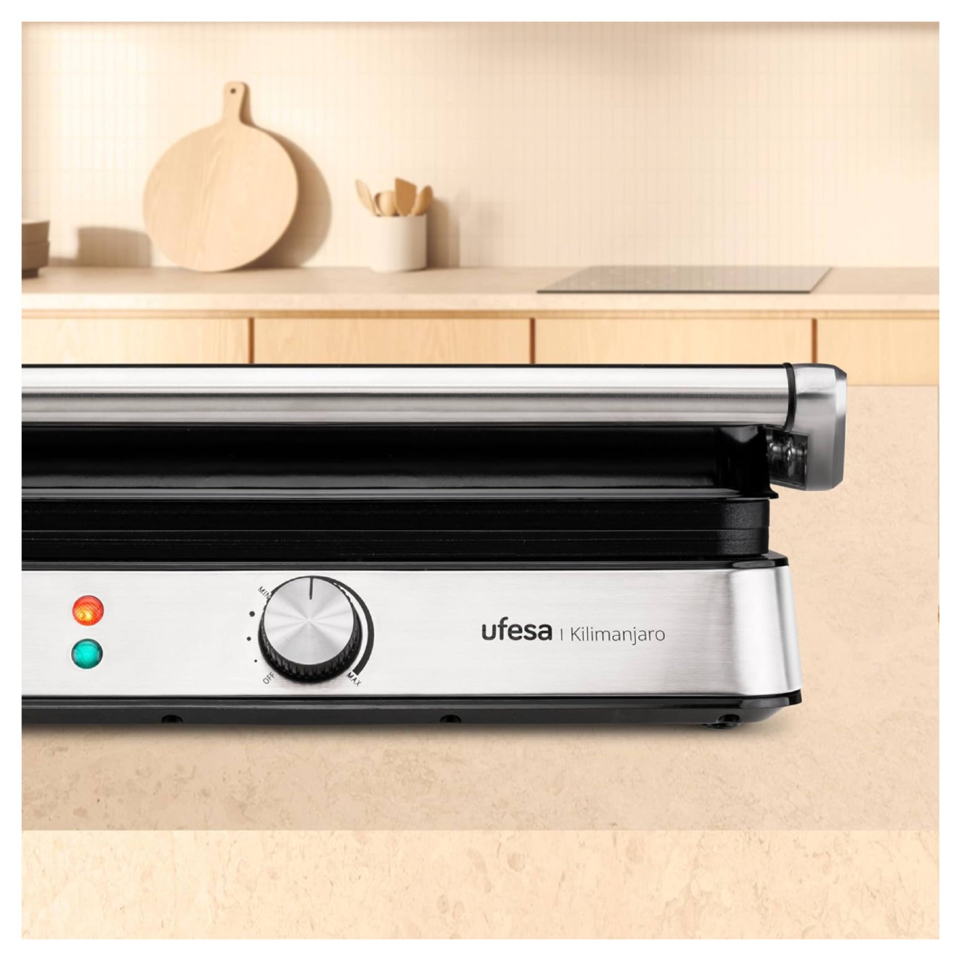 With the Kilimanjaro electric grill from UFESA, you can enjoy juicy and perfectly cooked meals easily and quickly, every day. With 2200W of power and large non-stick plates, it allows you to grill everything from meat and vegetables to toast and snacks, effortlessly and without sticking. The adjustable thermostat gives you full control over the temperature, while the full 180° opening option offers a double grilling surface ideal for large quantities. With an ergonomic design and a removable grease collection drawer, it is the ideal solution for healthy and quick grilling at home.