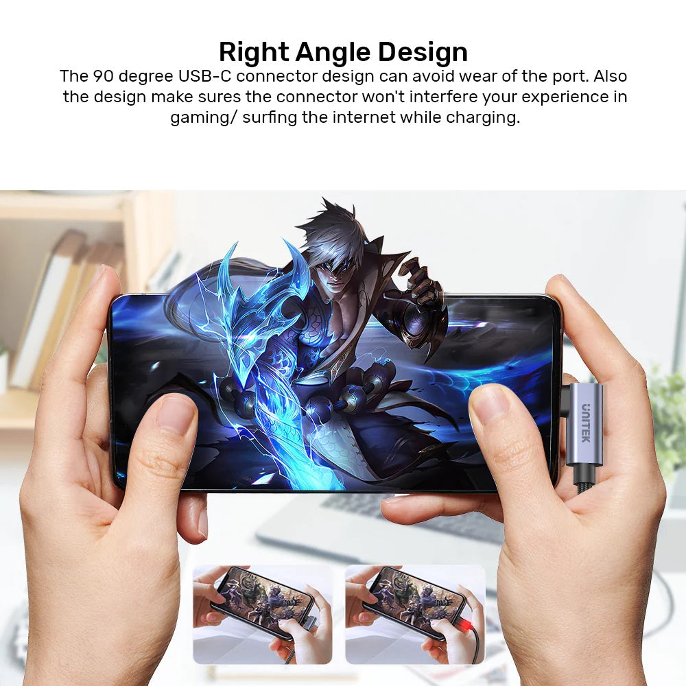 - 100W Fast Charging: UNITEK 90 Degree USB-C to USB-C cable can charge your device 52% faster than the ordinary 60W USB-C cable. Its 100W (20V 5A) output is suitable for charging laptops. For example it can charge MacBook Pro 13'' to 39% in 30 minutes and charge an iPhone 15 to 60% in just 30 minutes.