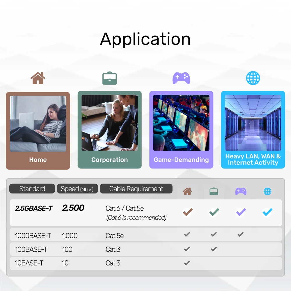 This USB adapter fully supports 2.5Gbps Ethernet which is a solution based on IEEE 802.3bz standard, 2.5 times speed comparing to 1000Mbps Ethernet. Under the cost-efficient consideration of keep using Cat.5e or Cat.6 LAN cable, instead of upgrading to 10GbE, this adapter offers an advanced Internet surfing experience.