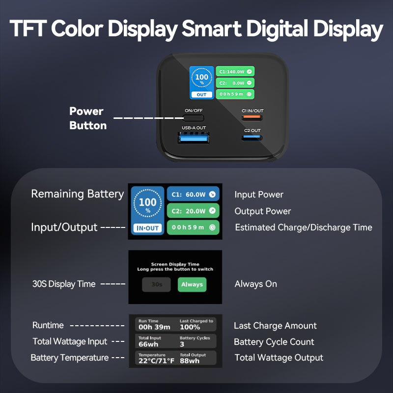 Digital Screen: Shows remaining battery percentage (%) and wattage per port.