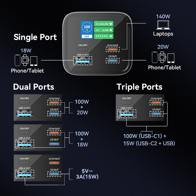 140W Max combined (e.g., 100W + 18W + 18W when using all ports).