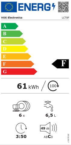 VOX DISHWASHER TABLE TOP, F, 6 SETS, 5 PROGRAMS, DELAYED START 2, 4, 6, 8H, HxWxD 438 X 550 X 500 MM, WHITE